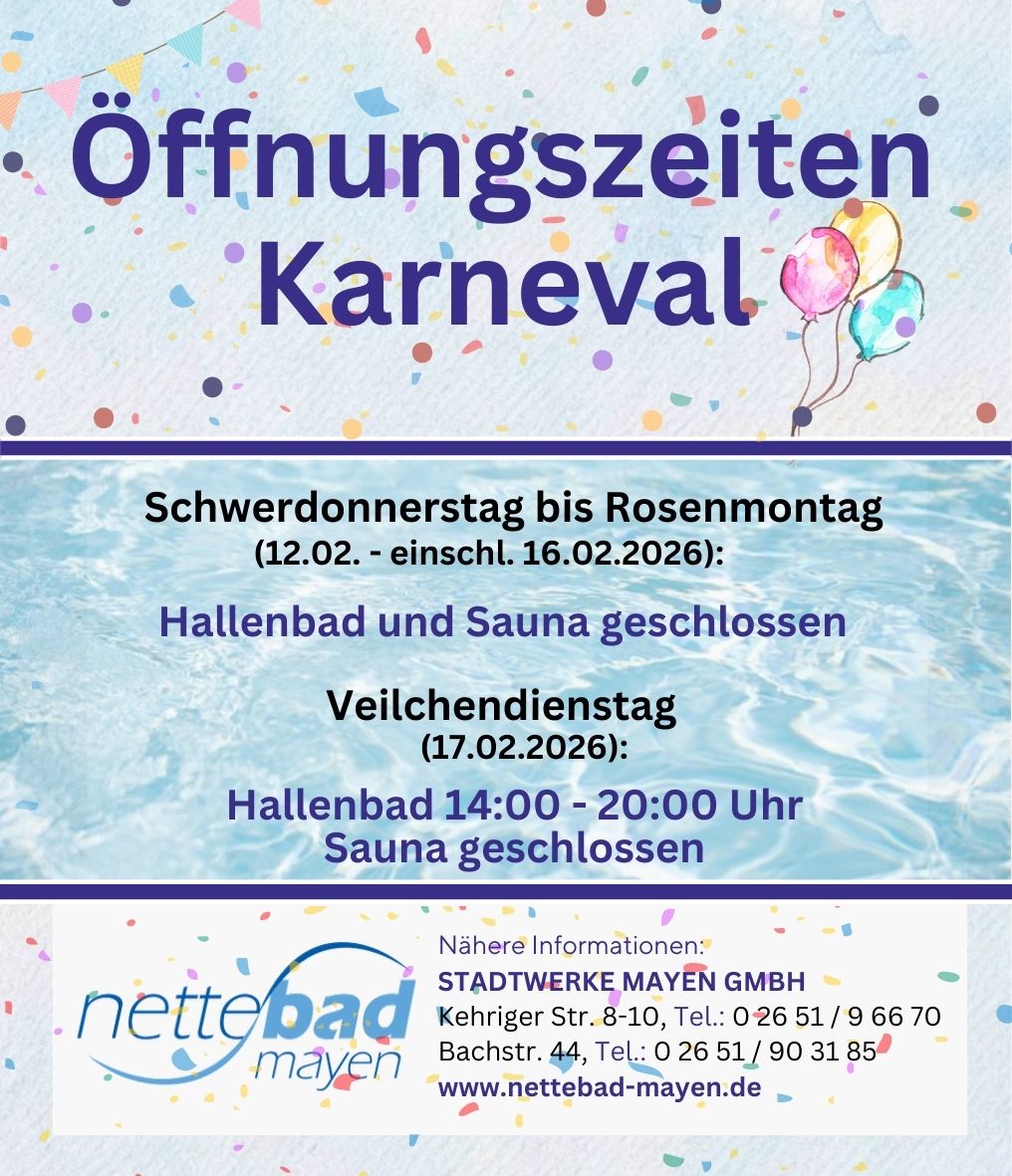 Von Schwerdonnerstag bis Rosenmontag (12.02. - 16.02.2026) ist das Nettebad komplett geschlossen.