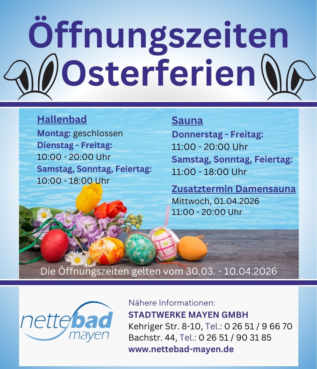 Während den Osterferien, von Montag, 30.03.2026 bis einschl. Freitag, 10.04.2026 ist das Nettebad Mayen wie folgt geöffnet: