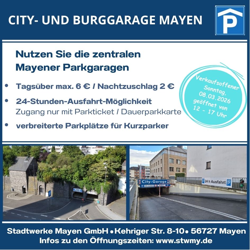 Mayen startet am 08.03.2026 mit einem verkaufsoffenen Sonntag in den Frühling: Auch die Mayener Burggarage und City-Garage werden von 12:00 bis 17:00 Uhr geöffnet sein.